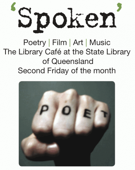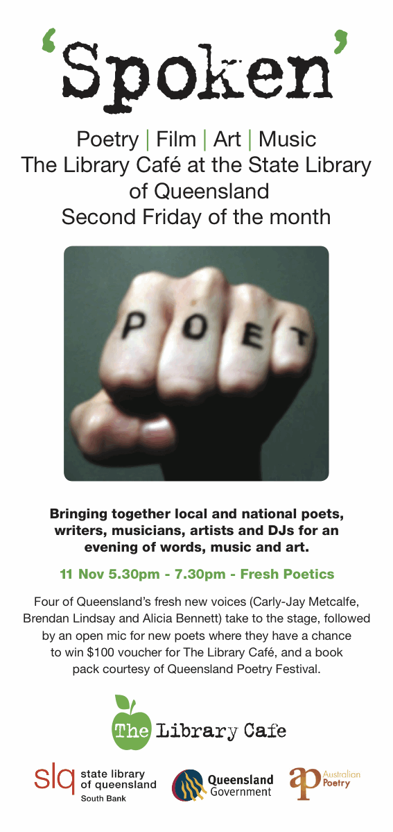 Posted bymandybeaumontOctober 8, 2011January 19, 2017Posted inUncategorized SPOKEN AT THE STATE LIBRARY OF QUEENSLAND CAFE As part of my residency at the State Library I’ve decided to put on SPOKEN. Here is the flyer for the first event! Come on down, there is an open mic with cash prizes! Related