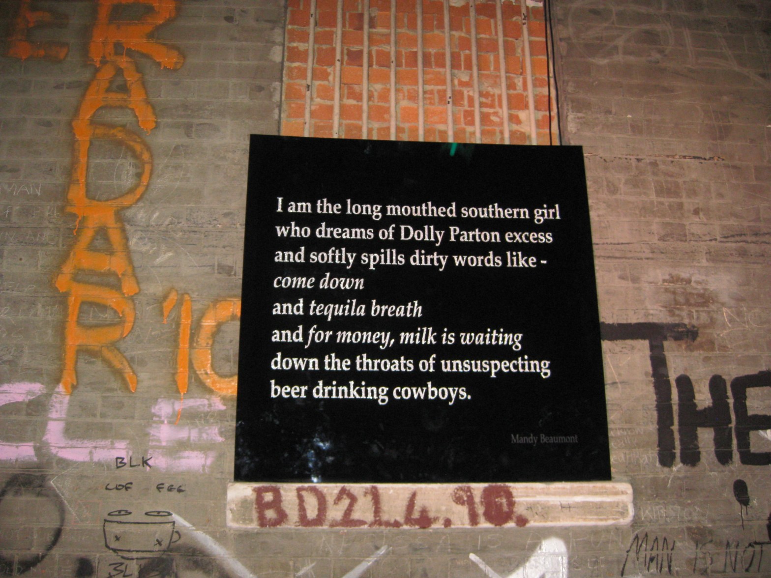 BRISBANE FESTIVAL I was asked to do some large scale poetry instillations for the Under the Radar Program as part of Brisbane Festival this year. It involved dirty country rock and roll, glittery 5 metre poems and the ‘Poetic Terrorism’ instillation, which was a whole heap of glitter and poems in balloons in the toilets.Continue reading